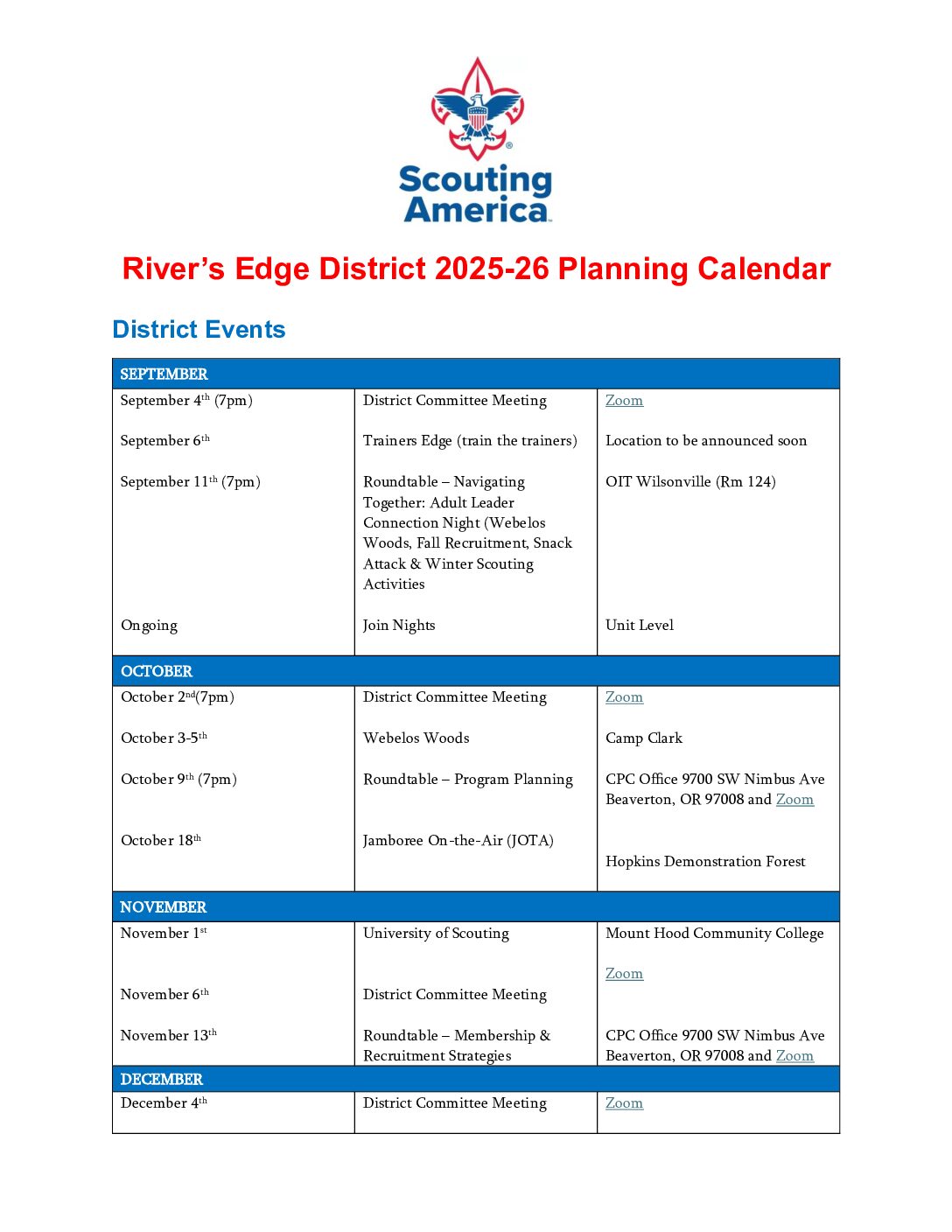 The Rivers Edge District of the Cascade Pacific Council, BSA, serves the Canby, Colton, Gladstone, Molalla, Newberg, North Marion, Oregon City, Sherwood, St. Paul, Tigard-Tualatin, West Linn/Wilsonville, Yamhill-Carlton school districts.